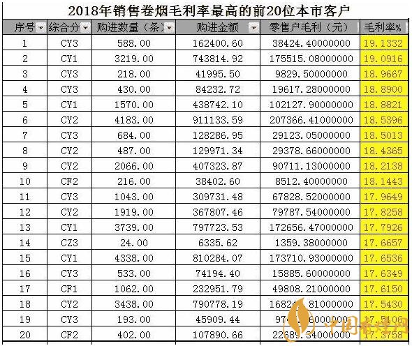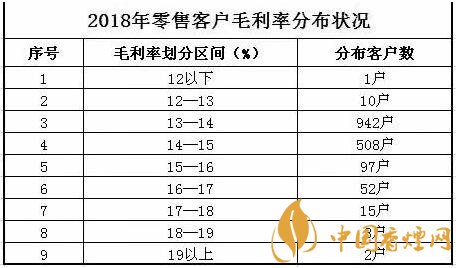 注:上表可以看出2018年卷煙商品毛利率超過超過19%的有2位客戶,其中數(shù)據(jù)顯示全市最低的零售客戶毛利率是11.67%。