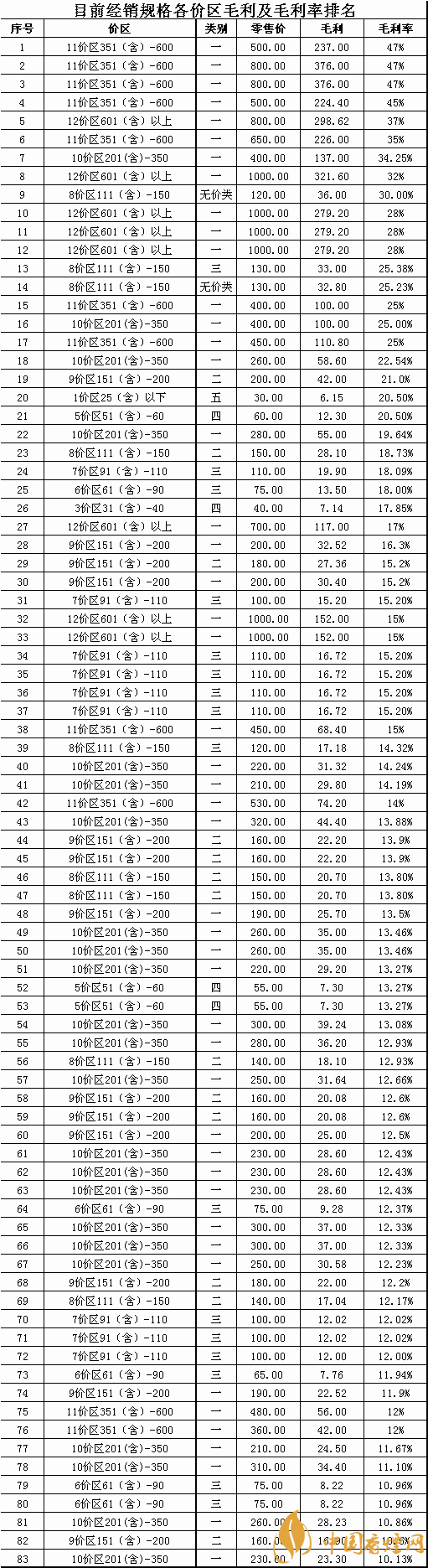 注:從目前全市經(jīng)銷的83個品牌批零差價可以看出,單品牌規(guī)格毛利率低于11%的僅有5個規(guī)格且全部高于10%的毛利率,部分溢價的規(guī)格產(chǎn)品毛利率已經(jīng)接近了50%,卷煙規(guī)格的平均毛利率達(dá)到了17.97%,然而這都預(yù)期的毛利,為什么真實的現(xiàn)狀是我們賺不到這應(yīng)該屬于我們自己的毛利率和毛利,是值得每一個卷煙經(jīng)營者深思和考慮的問題?為了保障大家的合法利益我們隱藏了商品名稱和商品編碼,有經(jīng)驗的零售客戶對照價區(qū)和商品獲利水平就可以清晰的對商品進(jìn)行定位,具體對應(yīng)商品規(guī)格請參照2019版《卷煙零售客戶服務(wù)手冊》卷煙價格一覽表有詳解。
