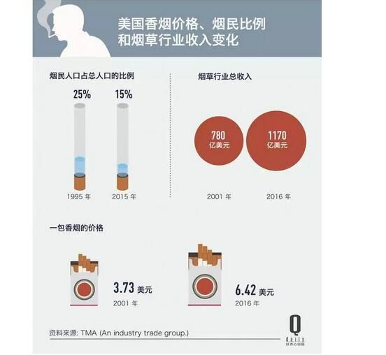 根據(jù)市場(chǎng)調(diào)研公司的報(bào)告,2001 年至 2016 年期間,美國(guó)香煙的銷售數(shù)量減少了 37%,與此同時(shí),美國(guó)吸煙人口的比例也下降了,但煙草公司的利潤(rùn)卻上升了。在2016 年,美國(guó)煙草行業(yè)的利潤(rùn)達(dá)到了 184 億美元。(跟我國(guó)一比這好像都不算什么了)
