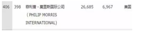 翻遍整個榜單,終于在末尾出發(fā)現(xiàn)了榜單唯一一家煙草公司--菲利普•莫里斯國際公司(簡稱菲莫國際,萬寶路就是它家生產(chǎn)的),以營收266.85億美元、利潤69.67億美元排名世界500強第406位。