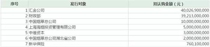 除去匯金公司和財政部,其余的發(fā)行對象中,中國煙草總公司、上海海煙投資管理有限公司、中維資本、中國煙草總公司湖北省公司四家均為“煙草系”法人。