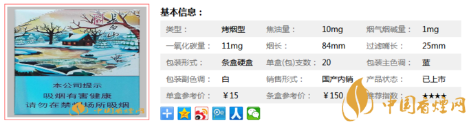 | 類(lèi)型 :烤煙型 | 焦油量 :10mg | 煙氣煙堿量 :1mg | 一氧化碳量 :11mg |