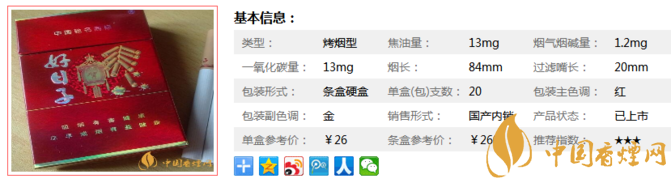 國(guó)內(nèi)第一款采用三元復(fù)合生物濾嘴的卷煙,利用分子篩專利技術(shù)吸附煙氣中一氧化碳、亞硝胺等,顯著降低煙氣中的有害成分,比較好地保護(hù)喉部、肺部和人體內(nèi)環(huán)境。下面我們一起來(lái)看雙喜硬金樽好日子的參數(shù)信息:焦油量:13mg 煙堿量:1.2mg 一氧化碳量:13mg。