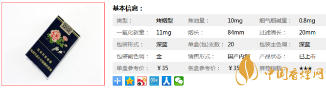 | 類型 :烤煙型 | 焦油量 :10mg | 煙氣煙堿量 :0.8mg | 一氧化碳量 :11mg |