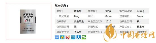 | 類型 :烤煙型 | 焦油量 :9mg | 煙氣煙堿量 :0.9mg | 一氧化碳量 :8mg |