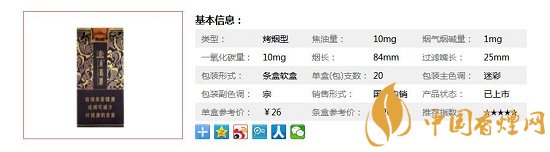| 類(lèi)型 :烤煙型 | 焦油量 :10mg | 煙氣煙堿量 :1mg | 一氧化碳量 :10mg |