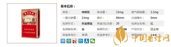 | 類型 :烤煙型 | 焦油量 :11mg | 煙氣煙堿量 :1.1mg | 一氧化碳量 :13mg |