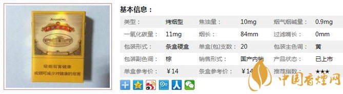 | 類型 :烤煙型 | 焦油量 :10mg | 煙氣煙堿量 :0.9mg | 一氧化碳量 :11mg |