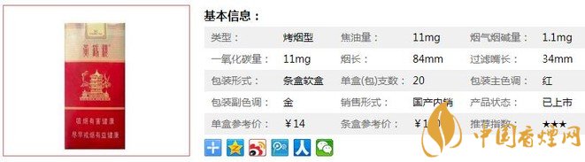 類型 :烤煙型 焦油量 :11mg 煙氣煙堿量 :1.1mg 一氧化碳量 :11mg