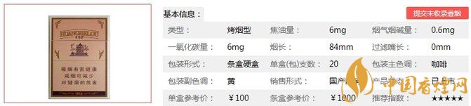 | 類型 :烤煙型 | 焦油量 :6mg | 煙氣煙堿量 :0.6mg | 一氧化碳量 :6mg |