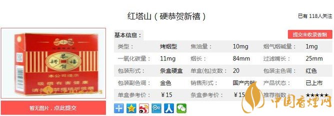 紅塔山硬恭賀新禧煙支長84mm,過濾嘴長:25mm,紅塔山(硬恭賀新禧)”首創(chuàng)“香氣移植技術(shù)”,并加入獨創(chuàng)“滇橄欖”提取物,以一縷悠然清香,推動煙草對其本味的充分演繹,自然甘香豐潤飽滿回味綿長。下面我們一起來看紅塔山硬恭賀新禧的參數(shù)信息:焦油量:10mg 煙堿量:1.0mg 一氧化碳量:11mg