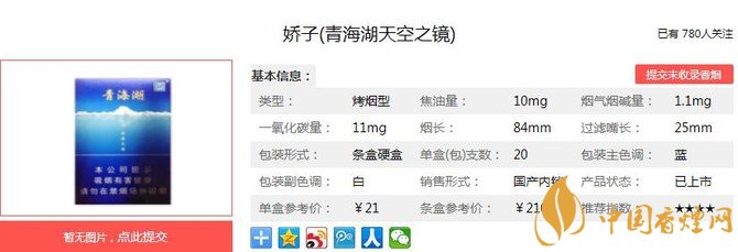 嬌子青海湖天空之鏡的包裝十分精致美觀,是一款令很多煙民因顏值而心動行動的香煙,但這款香煙地域性太強,以至于很多煙民都沒有見過。經香煙網(wǎng)小編市場調查嬌子青海湖天空之鏡售價為21元/包。