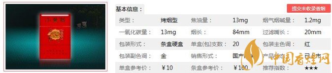 | 類型 :烤煙型 | 焦油量 :13mg | 煙氣煙堿量 :1.2mg | 一氧化碳量 :13mg |