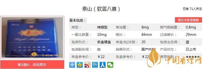 泰山軟藍(lán)八喜煙支長(zhǎng)84mm,過(guò)濾嘴長(zhǎng):29mm,開包聞香,頭香馥郁,以酸香氣為主,苔青風(fēng)格,兼有茴青香氣,香氣平和而多韻,后續(xù)繼之煙草本香,醇厚有力。下面我們一起來(lái)看泰山軟藍(lán)八喜的參數(shù)信息:焦油量:8mg 煙堿量:0.8mg 一氧化碳量:10mg