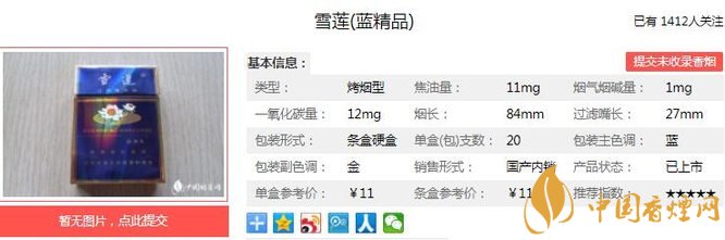 雪蓮藍(lán)精品煙支長(zhǎng)84mm,過(guò)濾嘴長(zhǎng)27mm,優(yōu)選國(guó)內(nèi)優(yōu)質(zhì)煙葉,應(yīng)用高分子合成技術(shù)等多項(xiàng)現(xiàn)代工藝技術(shù)精制而成;香氣自然、高雅,余味醇厚、干凈舒適。下面我們一起來(lái)看雪蓮藍(lán)精品的參數(shù)信息:焦油量:11mg 煙堿量:1.0mg 一氧化碳量:12mg