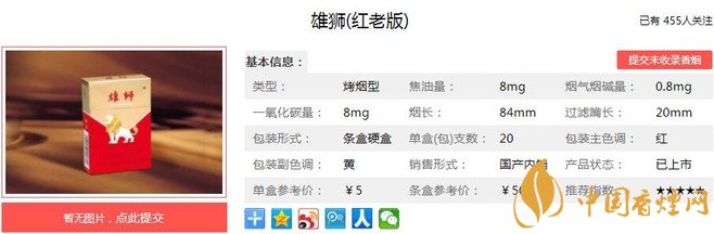 以上便是由香煙網(wǎng)小編為大家介紹的關于雄獅紅老版口感及參數(shù) 5元檔卷煙的領跑者的相關信息,想要了解更多有關內容請點擊: 紅金龍硬曉樓價格及參數(shù) 紅金龍硬曉樓口感分析