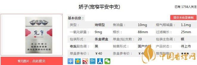 嬌子(寬窄平安中支)煙支長(zhǎng)88mm,過(guò)濾嘴長(zhǎng)25mm,過(guò)濾嘴紙張的色澤與煙盒相一致,同為灰色系列。以建筑符號(hào)為背景的紙張之上,寬窄與福字,對(duì)稱(chēng)呼應(yīng)。下面我們一起來(lái)看嬌子(寬窄平安中支)的參數(shù)信息:焦油量:10mg 煙堿量:1.1mg 一氧化碳量:9mg