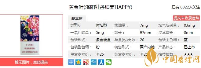 洛陽牡丹happy系列突出煙草自然本香,在傳承黃金葉風(fēng)格特點(diǎn)的同時(shí),更具有別樣的香氣特征,香氣優(yōu)雅飄逸,煙氣細(xì)膩柔和,吃味生津回甜,余味干凈舒適。經(jīng)香煙網(wǎng)小編市場調(diào)查黃金葉洛陽牡丹細(xì)支HAPPY售價(jià)為25元/包。