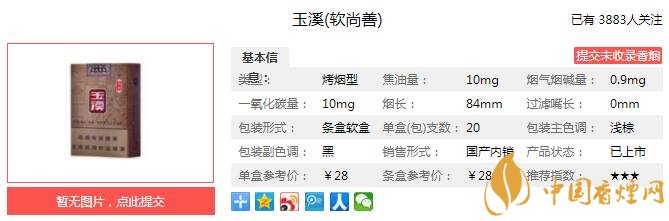 尚善玉溪秉承玉溪家族醇厚清香的經(jīng)典本味,精選云煙之鄉(xiāng)優(yōu)質(zhì)煙葉,煙葉配伍豐富而協(xié)調(diào),呈現(xiàn)溫潤醇香的細(xì)膩口感,軟包硬化的獨(dú)特包裝,完美保護(hù)每支尚善玉溪的卓越享受。經(jīng)香煙網(wǎng)小編市場調(diào)查玉溪軟尚善售價(jià)為28元/包。