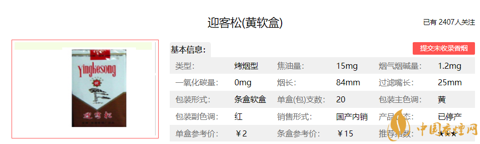類型 :烤煙型 焦油量 :15mg 煙氣煙堿量 :1.3mg 一氧化碳量 :12mg