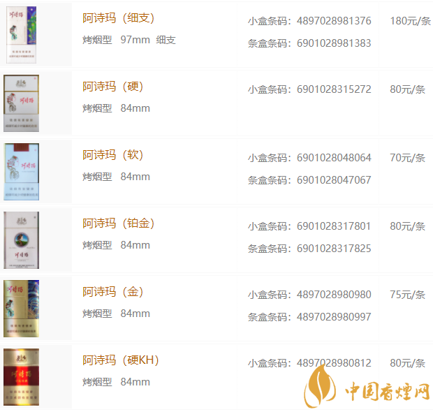 2020年阿詩瑪香煙價格表圖