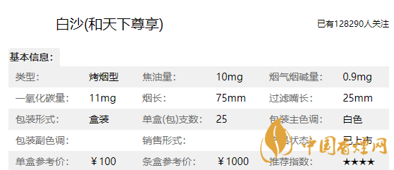 類型 :烤煙型 焦油量 :10mg 煙氣煙堿量 :0.9mg 一氧化碳量 :11mg