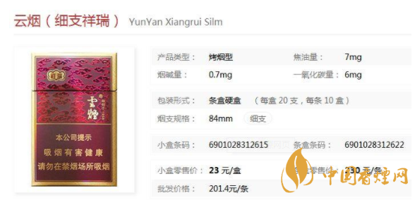 云煙祥瑞細(xì)支香煙價格表圖