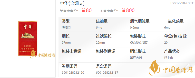 中華(金細(xì)支)是中華香煙系列中唯一的一款細(xì)支香煙,從外觀到內(nèi)在,整體都散發(fā)著一種卓爾不群的氣質(zhì),這款中華細(xì)支香煙上市后,也取得了很大的成功,同時(shí)也開創(chuàng)了高端中支香煙的潮流。有著遠(yuǎn)超于同價(jià)位卷煙的品質(zhì),被譽(yù)為是“細(xì)煙中的極品”。參考價(jià):800元/條。