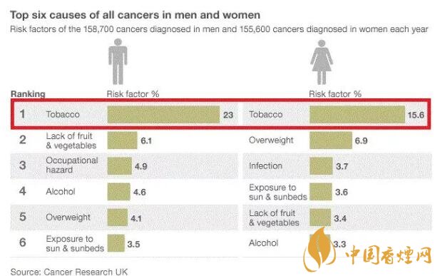 我國煙草生產(chǎn)量和消費(fèi)量穩(wěn)居世界第一,并擁有3億以上的煙民。雖然“吸煙有害健康”的標(biāo)語早已經(jīng)出現(xiàn)在大街小巷,但很多朋友只是莞爾一笑。其實(shí)這口號并非危言聳聽,煙草使用占所有死亡危險(xiǎn)因素的第2位。男性32.7%的癌癥死亡歸因于吸煙,遠(yuǎn)高于女性的5.0%。