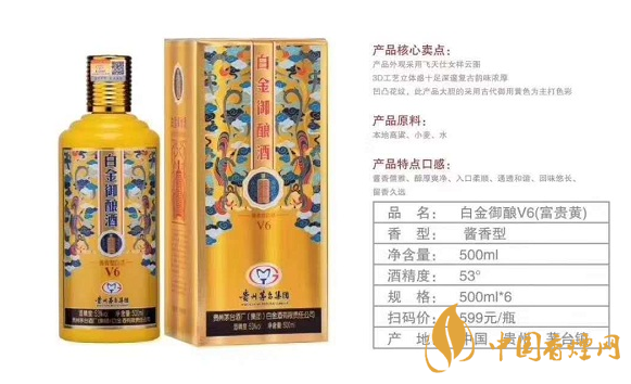 一款酒三個顏色,滿足不同場合需求。白金御釀V6(喜慶紅)包裝采用飛天仕女祥云圖,3D工藝立體感十足深邃復(fù)古韻味濃厚,凹凸花紋延用中國傳統(tǒng)節(jié)日喜慶紅色。適合婚宴用酒,V6(商務(wù)藍(lán))產(chǎn)品主題色彩根據(jù)古代唐朝大臣以為演變而來。特別適合商務(wù)贈送。V6(富貴黃)此產(chǎn)品大膽采用古代御用黃色為主題色彩。象征富貴,權(quán)勢。宴請接待自飲,高端大氣上檔次。白金御釀酒V6,屬于白金系列中端偏高產(chǎn)品,市場零售價格稍高,每瓶在500多元左右。