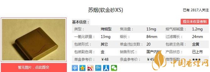 利群夜西湖煙支長(zhǎng)84mm,過(guò)濾嘴長(zhǎng)24mm,從外到內(nèi)在質(zhì)量都力求卓越,精工制作,追求高質(zhì)量、高檔次、高品味。下面我們一起來(lái)看蘇煙軟金砂XS的參數(shù)信息:焦油量:13mg 煙堿量:1.2mg 一氧化碳量:13mg