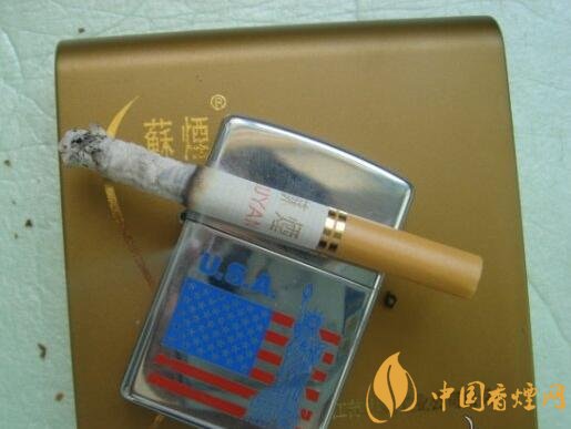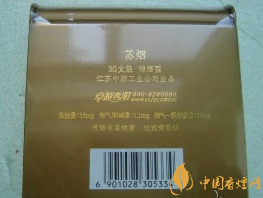 暗金色塑盒包裝,主體為方形,上下兩側(cè)作弧形處理,給人以輕巧圓潤(rùn)之感。正面左側(cè)一道極似女人身體曲線的“S”形劃過(guò),旁邊有繁寫(xiě)的“蘇煙”二字,右下方是“江蘇中煙工業(yè)公司出品”,設(shè)計(jì)簡(jiǎn)約,表意婉約。背面標(biāo)有商品的基本信息(包括三項(xiàng)理化指標(biāo)、條形碼等)和警示語(yǔ)。其余四面皆無(wú)文字或圖案。