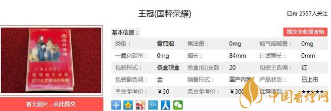 王冠國粹榮耀是一款機(jī)制型的雪茄煙,它的煙支長短和普通香煙一樣,焦油含量為適中。以國內(nèi)最優(yōu)質(zhì)的煙葉原料,配以進(jìn)口的煙葉,經(jīng)自然的醇化發(fā)酵,精心調(diào)味之后,機(jī)卷而成。但是做口糧大部分人肯定不習(xí)慣,偶爾嘗嘗還是不錯(cuò)的選擇。經(jīng)香煙網(wǎng)小編市場調(diào)查王冠國粹榮耀售價(jià)為30元/包。