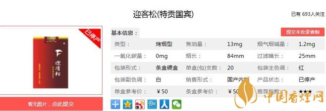 利群夜西湖煙支長84mm,過濾嘴長25mm,煙支的設(shè)計簡潔大方,金色的品名迎客松與YINGKESONG被一條金箍相隔,白色豎紋盤紙包裹的煙支修長挺拔。下面我們一起來看迎客松特貢國賓的參數(shù)信息:焦油量:13mg 煙堿量:1.2mg 一氧化碳量:12mg