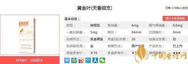 黃金葉天香細(xì)支類別為“高一類A(細(xì)支)潛力規(guī)格”,烤煙類型。外包裝沿襲天葉低調(diào)奢華的品系風(fēng)格,一如既往的黃金標(biāo)準(zhǔn),一絲不茍的手捻精神,和大小天葉系列一脈相承,據(jù)香煙網(wǎng)小編市場(chǎng)調(diào)查它的零售參考價(jià)為55元/包。