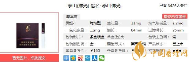 泰山拂光俗稱泰山佛光,自上市以來,以其獨(dú)特醉人的“茶甜香”風(fēng)味風(fēng)靡市場,吸收借鑒了其他高端品牌手工制作這一特點(diǎn),并在泰山拂光這款高端卷煙中深刻體現(xiàn)。被消費(fèi)者譽(yù)為“近年來最好的高端卷煙之一”。經(jīng)香煙網(wǎng)小編市場調(diào)查泰山拂光售價為160元/包。