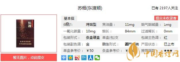 蘇煙東渡順煙支長84mm,過濾嘴長36mm,深棕的過濾嘴上有一條降焦線,字體較大的東渡字樣,以及與煙盒底部相同的印章順字印制于過濾嘴紙上的兩側(cè)。金色水松紙上印制的是一帆風(fēng)順字樣,完全呼應(yīng)了煙盒背面帆船的設(shè)計(jì)。下面我們一起來看蘇煙東渡順的參數(shù)信息:焦油量:11mg 煙堿量:1.0mg 一氧化碳量:10mg