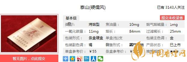 泰山硬儒風(fēng)煙支長(zhǎng)84mm,過(guò)濾嘴長(zhǎng)25mm,“儒風(fēng)泰山”的配方和調(diào)香技術(shù)嫁接了緩解精神壓力的“香薰”機(jī)理,發(fā)揮SPA功效創(chuàng)造出一種“心悅神定”的氣氛。下面我們一起來(lái)看泰山硬儒風(fēng)的參數(shù)信息:焦油量:10mg 煙堿量:1.0mg 一氧化碳量:11mg