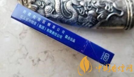 煙盒正反版面一樣,上蓋位置有雪峰日照金山,彌漫的云霧拱衛(wèi)金頂。只是細支的這個圖片質量不太理想。煙盒的中部是金色藏文書寫風格的“雪域”字樣。居中,有藍色的蓮花座圖案。下有銀色小字——西藏自治區(qū)煙草公司總經銷。