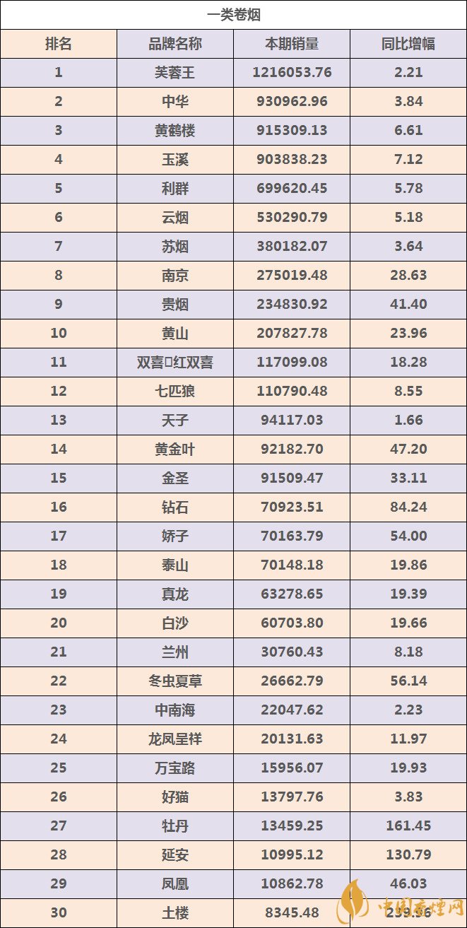 2018年煙草行業(yè)都在全力推動(dòng)煙草行業(yè)高質(zhì)量發(fā)展,奮力把煙草行業(yè)各項(xiàng)工作推上一個(gè)新臺(tái)階。煙草行業(yè)在改革發(fā)展過(guò)程中“高質(zhì)量發(fā)展”成為重中之重,而在此過(guò)程中消費(fèi)升級(jí)環(huán)境下的“結(jié)構(gòu)提升”更顯作用突出。那么大家最關(guān)心的卷煙品牌銷(xiāo)量情況如何呢?下面就由香煙網(wǎng)小編帶大家一起來(lái)了解一類(lèi)煙卷煙品牌TOP30強(qiáng)的基本情況: