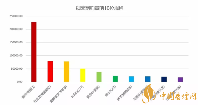 2、如圖所示2018細支煙排行榜(規(guī)格銷量)圖:在2018第一季度中國細煙排行中1-3月細支煙銷量前10規(guī)格:第一名南京(炫赫門)/第二名紅金龍(硬藍愛你)/第三名黃鶴樓(天下名樓)/第四名:長白山(777)/第五名:黃金葉(愛尚)/第六名:泰山(心悅)/第七名:嬌子(格調細)/第八名:芙蓉王(硬細支)/第九名:云煙(細支云龍)/第十名:好貓(細支長樂)