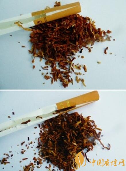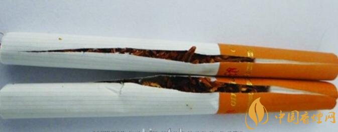 真品煙支濾嘴棒25mm,煙絲顏色為金黃,煙絲彈性好,添加中草藥提取物“豐和液”,具有特殊香味;假煙煙支濾嘴棒只有19mm,煙絲含末量大,煙絲顏色多為褐黃色,煙絲添加大量化學香精香料,香味刺鼻,與真品存在明顯差異。