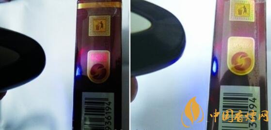 真品小盒在驗鈔燈的照射下,防偽區(qū)立刻呈現出紅色“豐和”兩個字,關閉驗鈔燈又能復原防偽區(qū);假煙在驗鈔燈的照射下,防偽區(qū)無任何變化,與真品存在明顯差異。
