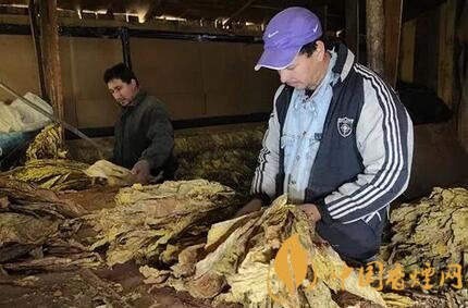 茄衣所采用的煙葉按生產(chǎn)條件一般分為陰植葉和陽植葉。不管是哪一類,茄衣煙葉在收成后一般以50葉為一束捆版,然后送往種植園中專用的茄衣倉庫進入干燥程序。這是第一道工序,茄衣束被掛在倉庫高處的木桿上,這個過程需很小心地控制溫度和濕度。這道工序是為了使葉片中的葉綠素轉(zhuǎn)化為葉紅素,一般情況下約需一至兩個月時間。