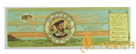 他的背后,兩艘艦艇正乘風(fēng)破浪,揚(yáng)帆前行,近處,還有一只金黃色的鐵錨在海面上沉沉浮浮。左上角的橢圓形框內(nèi),簡筆畫了些房子和疊幢的碎石,其下寫有英文“NOTTINGHAN CASTLE REGISTERED”的字樣,意思為“諾丁漢城堡”,是它的注冊商標(biāo)。煙標(biāo)靠右一隅,是由麻繩結(jié)出一個長方形框,內(nèi)為黃色填充,上書褐色英文字,大意是介紹該水手牌卷煙是來自弗吉尼亞的純真煙草而制作的高級卷煙,其溫和度以紅印記標(biāo)注,其中醇度以藍(lán)印記標(biāo)注。較為醒目的是由救生圈兩端各引出一根腰際線,上面各寫有“MEDIUM”,即此煙為中醇類卷煙,也就是焦油含量不高。