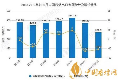 2019年前10月中國烤煙出口量突破9萬噸。據(jù)中國海關(guān)總署數(shù)據(jù)顯示,2019年10月中國烤煙出口量為6128噸。累計方面,2019年1-10月中國烤煙出口量達(dá)到91054噸,同比下降12.1%。