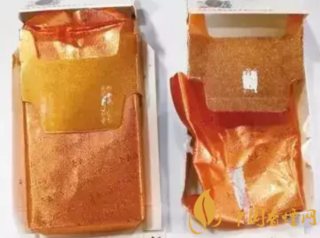 真煙小盒左上角“冬蟲”和背面“夏草”兩字有立體感,肉眼直觀看上去如同寶石一般有凸起感,圖案中間的閃光點要轉(zhuǎn)動才能看到;假煙看上去平坦沒有立體感,圖案中間的閃光點每個角度都可以看到。(左真右假)