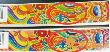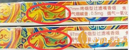 如下圖標(biāo)示,此處圖案真煙為藍色,假煙則變成了綠色;真煙的線條為黃色,假煙變成了紅色;真煙為綠色的圓珠外面為藍色的底色,假煙都變成了綠色。(上假下真)