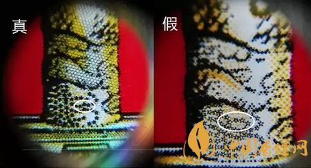 鑒別真假“中華”的關(guān)鍵在于用放大鏡查看條包兩端中英文字母的邊緣有無(wú)放射鋸齒,真“中華”的字體在放大后邊緣依然很規(guī)整,無(wú)鋸齒。假“中華”卷煙的字體在用20倍放大鏡觀察邊緣呈明顯的鋸齒狀。