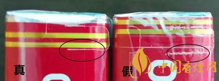 真品硬中華小盒拉帶頭為半圓形,邊緣光滑無(wú)毛渣;假煙小盒拉帶頭半圓形不規(guī)則,邊緣不夠光滑,有毛渣。